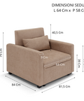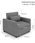 • Dimensioni divano in CM: Larghezza 81,5 Cm; Profondità 84 Cm; Altezza totale 79 Cm; Altezza Seduta-Terra 39 CM; Altezza Bracciolo-Terra 56 CM; Altezza Schienale 40,5 Cm; Larghezza Bracciolo 9 Cm; Larghezza Seduta 64 Cm; Profondità Seduta 58 Cm.