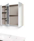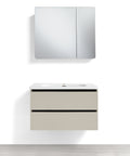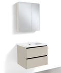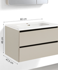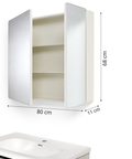 • PEONIA 80: Composta da un mobile sospeso a due cassetti dalle dimensioni L 81 x P 47,5 x H 48 cm e una specchiera a due ante dalle dimensioni L 75 x P 11 x H 68 cm;
