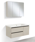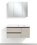 • PEONIA 100: Composta da un mobile sospeso a un'anta e un due cassetti dalle dimensioni L 102 x P 87,5 x H 48 cm e una specchiera a tre ante dalle dimensioni L 90 x P 11 x H 68 cm;