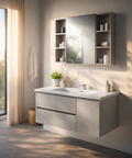 Il set da bagno Altea 100 è una soluzione dal design moderno ed essenziale, ideale per ambienti contemporanei che richiedono funzionalità e stile. Il mobile bagno sospeso è realizzato in alluminio e dotato di due cassetti e un’anta, perfette per organizzare prodotti e accessori mantenendo l’ambiente ordinato. Le linee pulite donano un tocco di eleganza e luminosità allo spazio. Il mobile base misura L 101 x P 48 x H 48,5 cm ed è completo di lavabo in ceramica, resistente e facile da pulire, perfettamente integrato nel design complessivo. La composizione è completata da una specchiera sospesa a un’anta dalle dimensioni L 90 x P 13,5 x H 68 cm, pratica e capiente, ideale per riporre prodotti da toilette e accessori quotidiani, mantenendo una superficie visivamente pulita. Il set è disponibile in un’unica finitura Cipria. Grazie alla struttura sospesa, il mobile facilita la pulizia del pavimento e contribuisce a creare un effetto visivo leggero e ordinato. Una proposta elegante e funzionale, perfetta per arredare il bagno con stile e praticità.