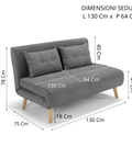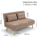 • Dimensioni divano in CM: Larghezza 130Cm; Profondità 75 Cm, Altezza 78 Cm, Altezza Seduta 41 Cm, Altezza Schienale 40 Cm, Altezza Piedini 18 Cm, Larghezza Seduta 130 Cm; Profondità Seduta 64 Cm.